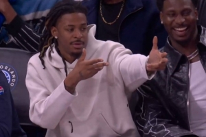 在场下总没事了吧?贝恩命中三分球 莫兰特场边开枪庆祝