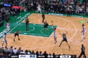高难度!马克西借恩比德掩护漂移三分命中 率队再度追到1分