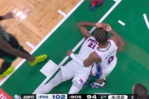 这下够狠的!恩比德篮下强攻被奎塔犯规打倒在地