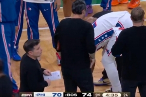 无大碍!恩比德腿部被杰伦·布朗顶了一下 简单调整后返场作战