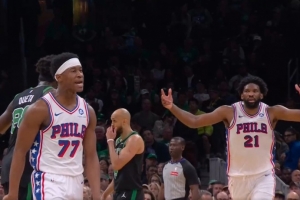 没悬念了吧!埃奇库姆再中三分&恩比德庆祝 绿军近5分钟不得分